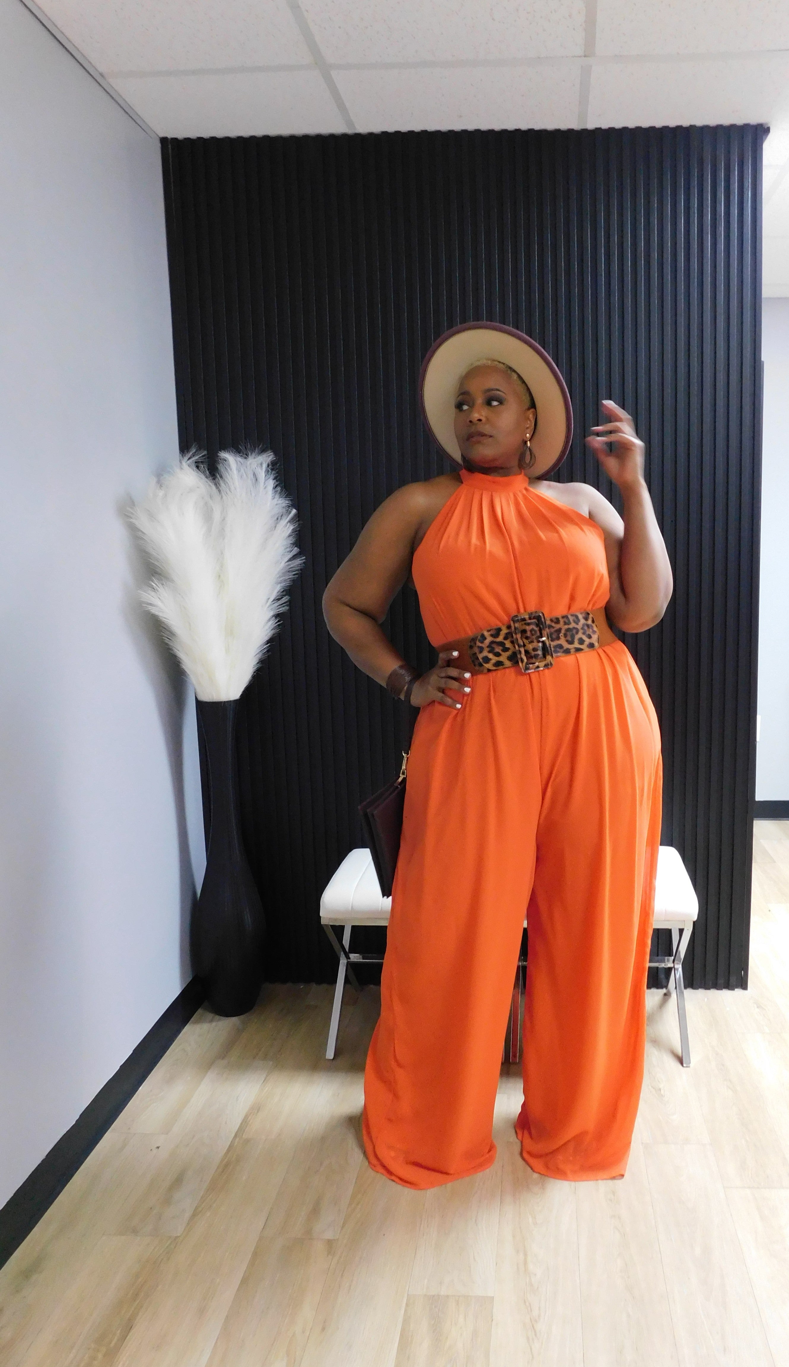 The Lady In Orange jumpsuit is to be worn boldly.  Stepping out and being seen in the crowd is what this vibrant color provides.  She screams elegance at first sight.  You can belt her or wear her without a belt for a little extra flow.  Baby she's the 1 and NOT the 2... OKAYYY.