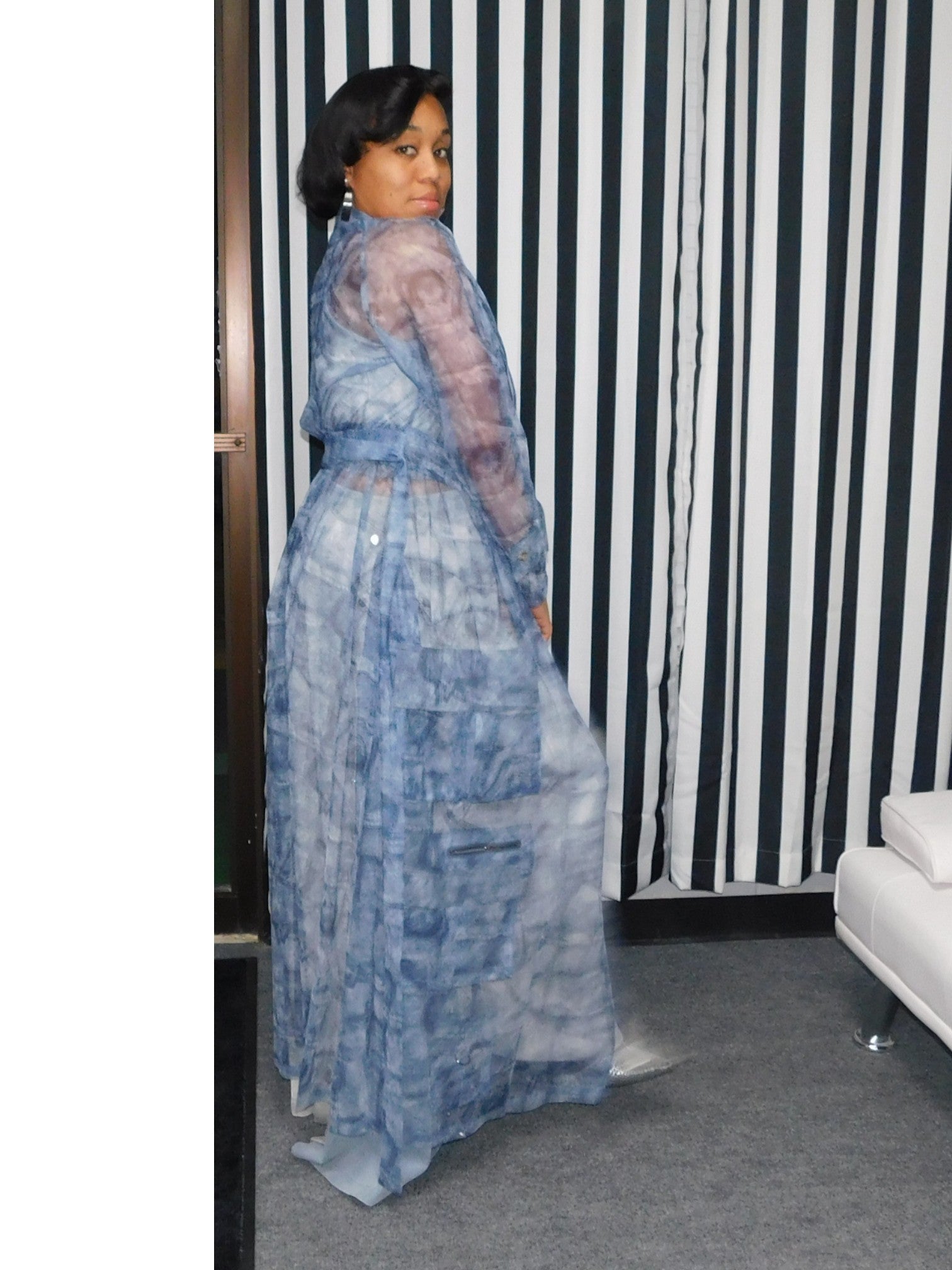 The Denim Sheer Organza Duster is a statement piece.  Design to add uniqueness to your outfit.  She has multiple pockets, a closure tie, a belt...