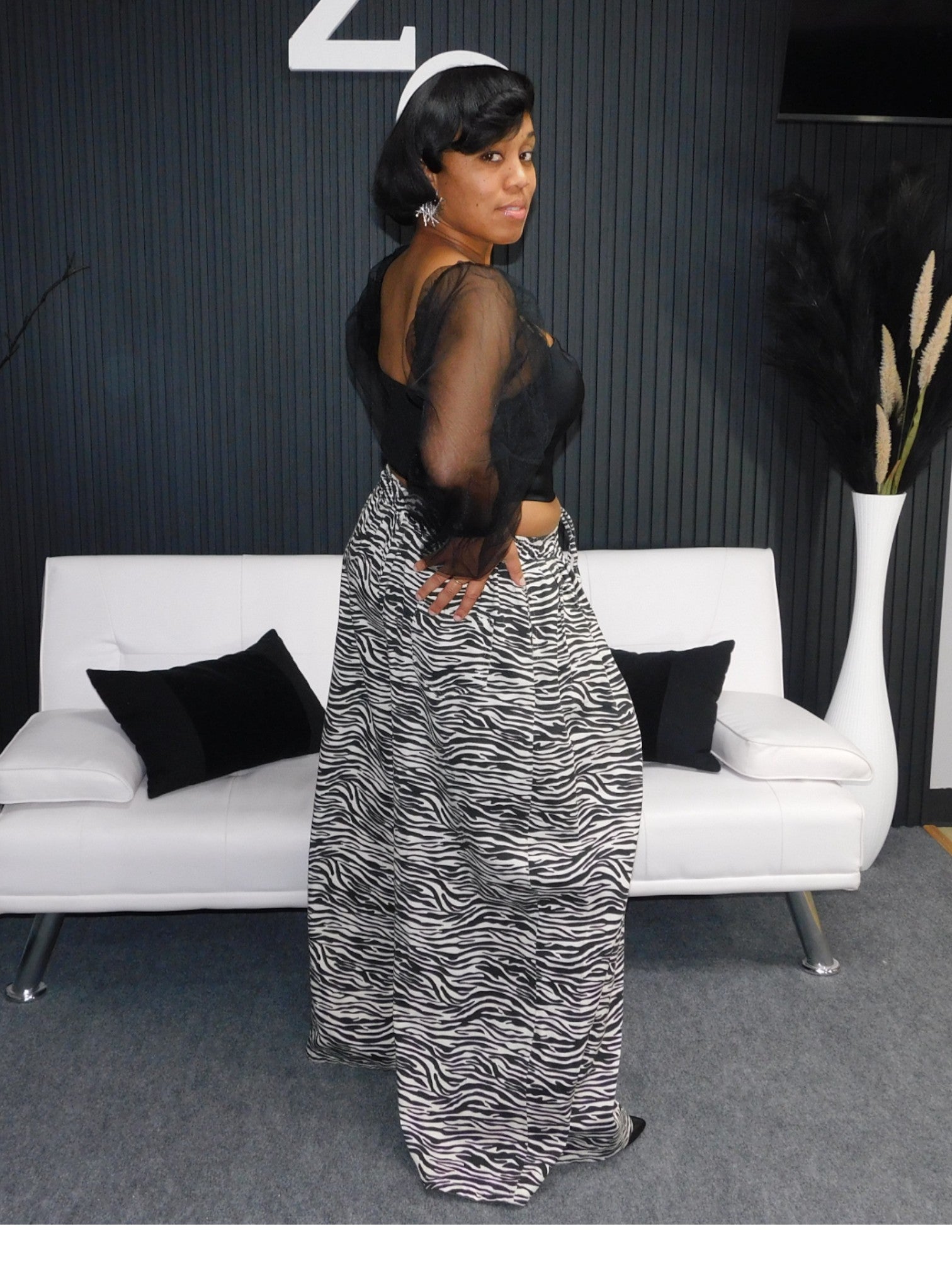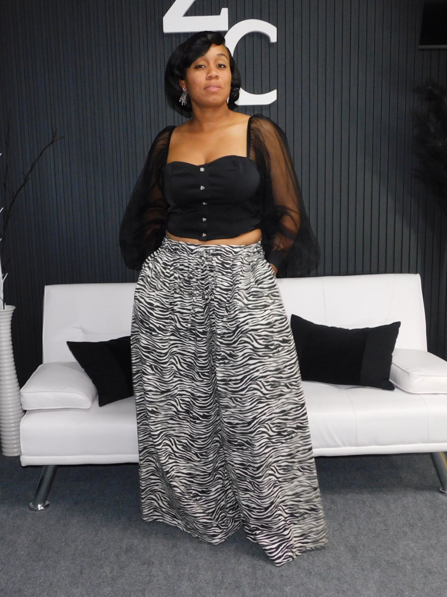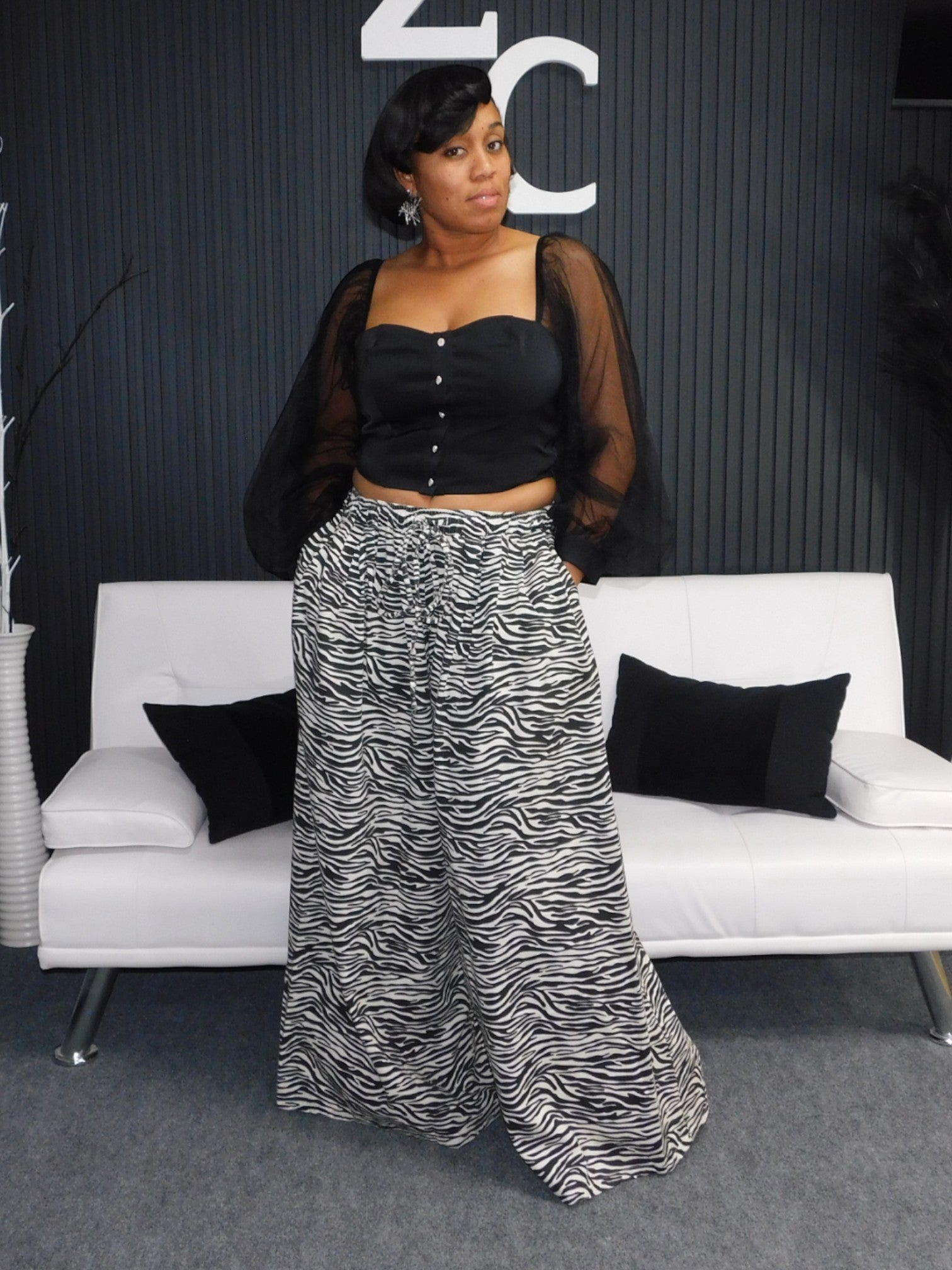 Zebra printed denim palazzo pants, with great stretch, elastic waist,  wide legs, and pockets.   If you ever thought about making a statement, here you go.  Walk boldly in being different and wearing something that will have everyone talking.   Become the statement piece.