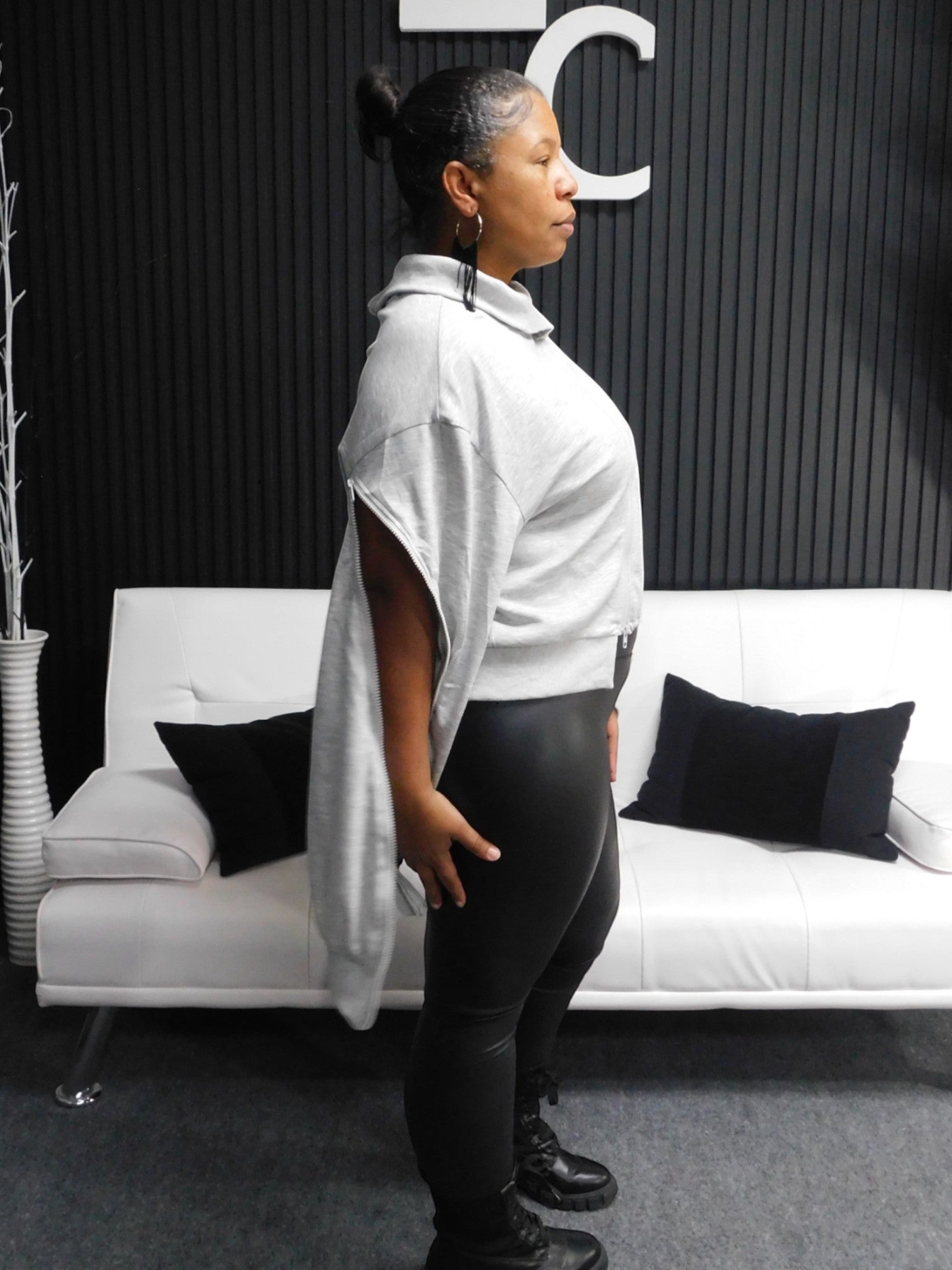 The Don't Sweat Me Top is unique in design with versatility.  The zippers on this piece is what makes it so versatile.  You can unzip the front, the back and the sleeves as well as this piece being asymmetrical, she can go with you to airport or style her as you see below.  She is edgy but fierce at the same time.